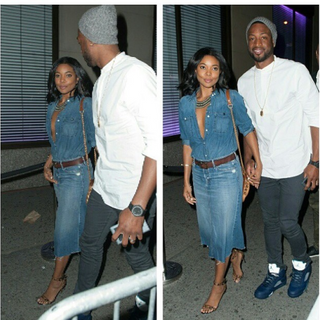 Gabrielle Union owns it in this photo, as her duck face says it all! The trend of denim on denim is back and she presents it ever so effortlessly. Wearing a fringed midi- denim skirt partnered with a denim-buttoned shirt and rolled sleeves Gabrielle leaves only two buttons buttoned, unafraid to show skin. The brown belt sets off a natural toned look, just as the tan satchel purse to her left. Her open-toed leopard shoes are fun, but not too high following the casual look. Her hair is in a lose curl, and makeup natural but with a soft rose lip. Her necklace of black and rose gold isn’t a distraction and takes a backseat to the denim on denim however; it plays the role of complimenting her flawless skin. She makes it obvious that it’s okay to be sexy, casual and fun! With husband Dwayne Wade, in hand, Dwayne whips out the blue as well. Dwayne encompasses a “Hip-Hop meets Rocker” look, starting off with blue Jordan’s and denim skinny jeans. His white quarter length white buttoned shirt, grey beanie, and all black round-faced watch work well together because the basic colors of white and grey do not overshadow the off-black jean and blue Jordan’s. The gold chain takes the eye off of the plain white shirt, making the main point of reference the blue Jordan’s. Who knew the color blue would make a couple look and feel so good?