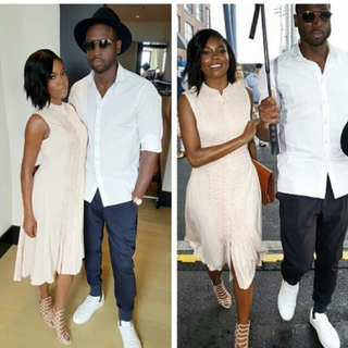 Rocking in this light and clean ensemble, Gabrielle is wearing a nude knee-length dress with buttons aligning vertically throughout the middle of the dress. The bottom of the dress falls with pleats. Her nude strapped pumps keep the theme of nude while accessorizing with a camel colored clutch. Her makeup also follows the theme due to the nude lip and natural makeup. She keeps it simple with her wavy short cut. Dwayne Wade is rocking a more relaxed look, as his sleeves are rolled in a white collared white shirt and off black pants. Dwayne’s footwear, are all white low-top sneakers, perfectly matching with the top. His black hat is a wide-flat brim and leaves a cool impression, not to mention his black shades. His leather, camel banded, round faced watch matches Gabrielle’s clutch. They both successfully execute this simplistic clean look, with light color combinations.
